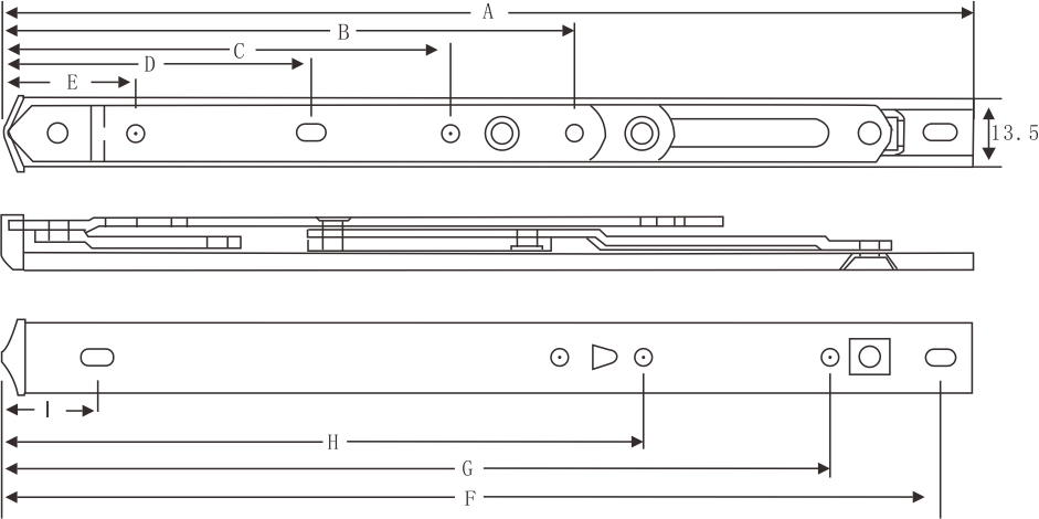 | 連桿數(shù)量 | 折片厚度(mm) | 規(guī)格\值 | A | B | C | D | E | F | G | I | 窗最高(mm) | 窗最寬(mm) | 窗最重(kg) | 開啟角度(±2°) |