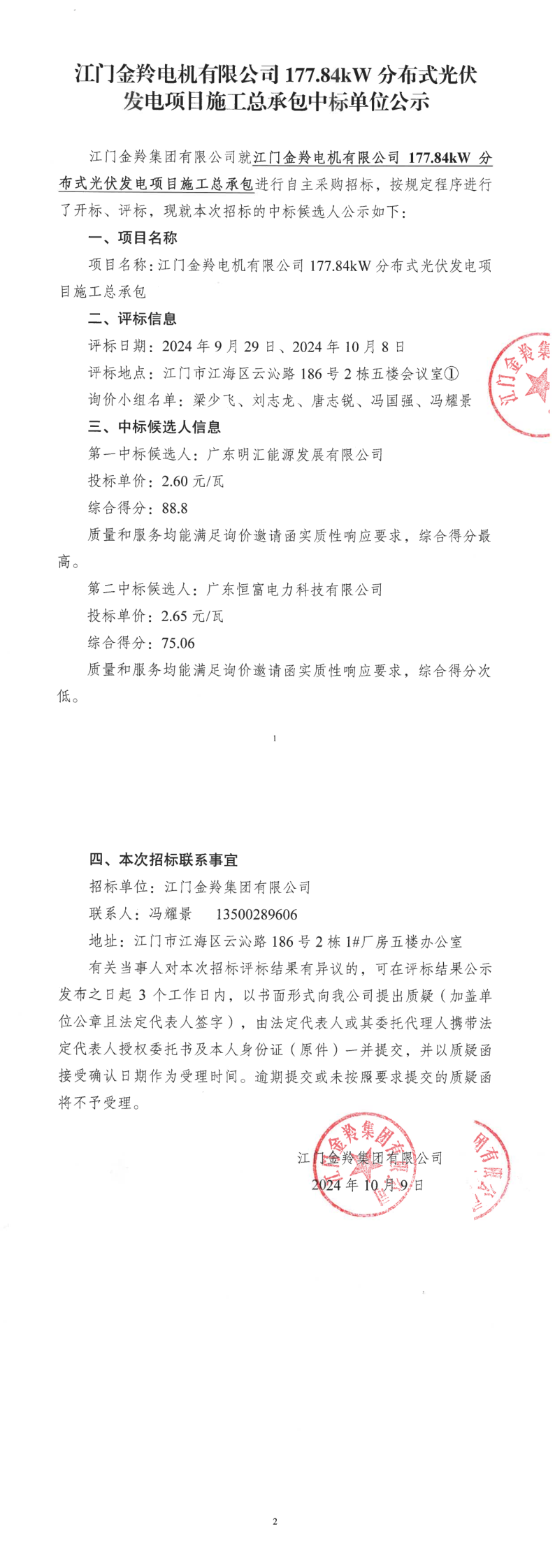 江門金羚電機有限公司177.84kW分布式光伏發電項目施工總承包中標單位公示