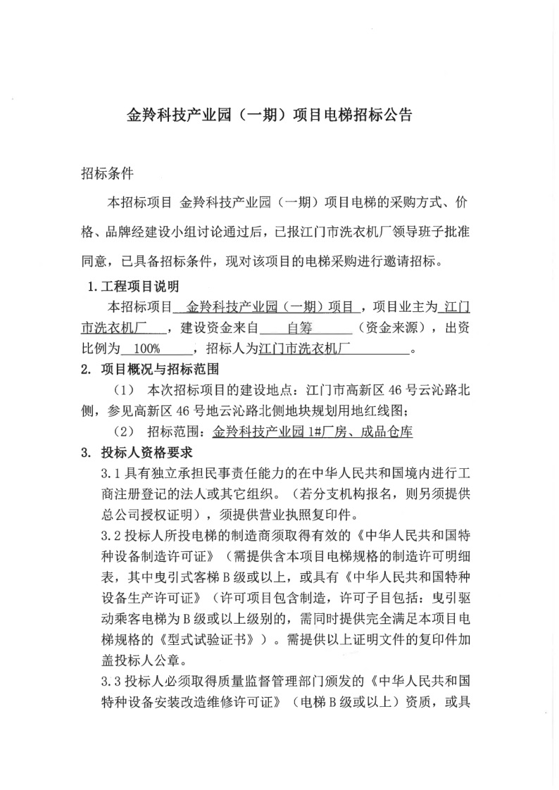 金羚科技產業園(一期)項目電梯招標公告