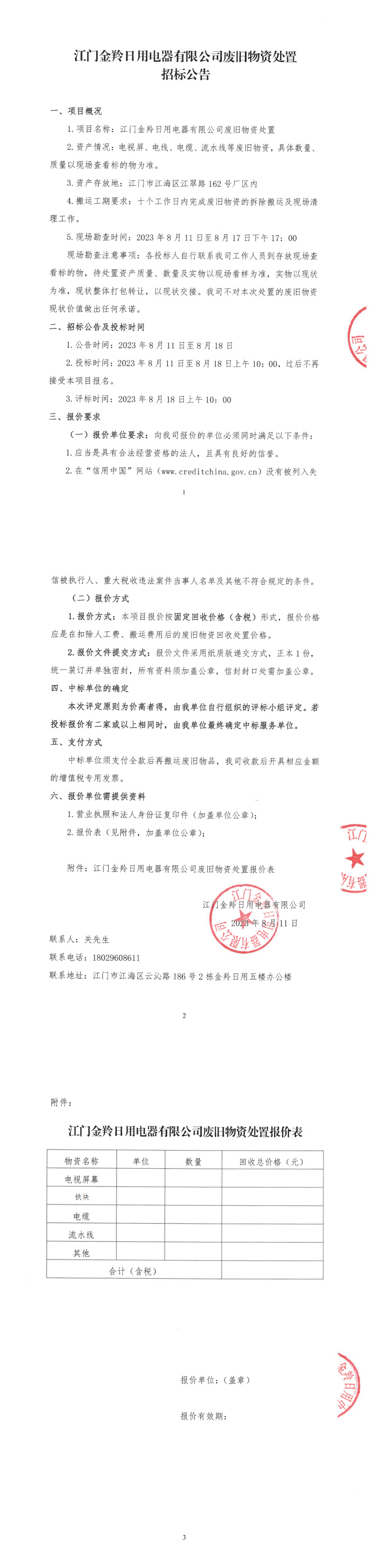 江門金羚日用電器有限公司廢舊物資處置招標公告