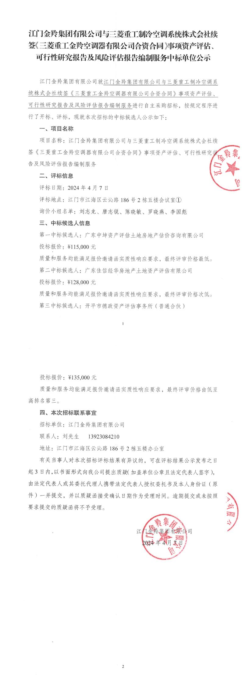 江門金羚集團有限公司與三菱重工制冷空調(diào)系統(tǒng)株式會社續(xù)簽《三菱重工金羚空調(diào)器有限公司合資合同》事項資產(chǎn)評估、可行性研究報告及風險評估報告編制服務中標單位公示