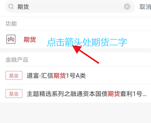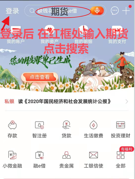 1、安裝手機銀行,并登錄,打開首頁,搜索“期貨”;